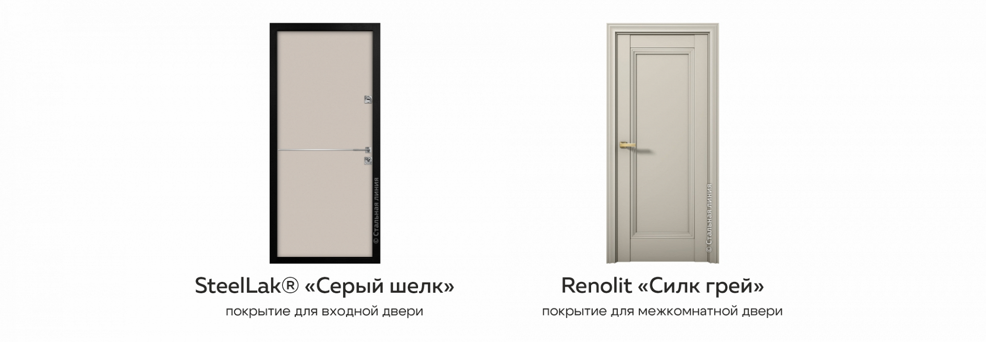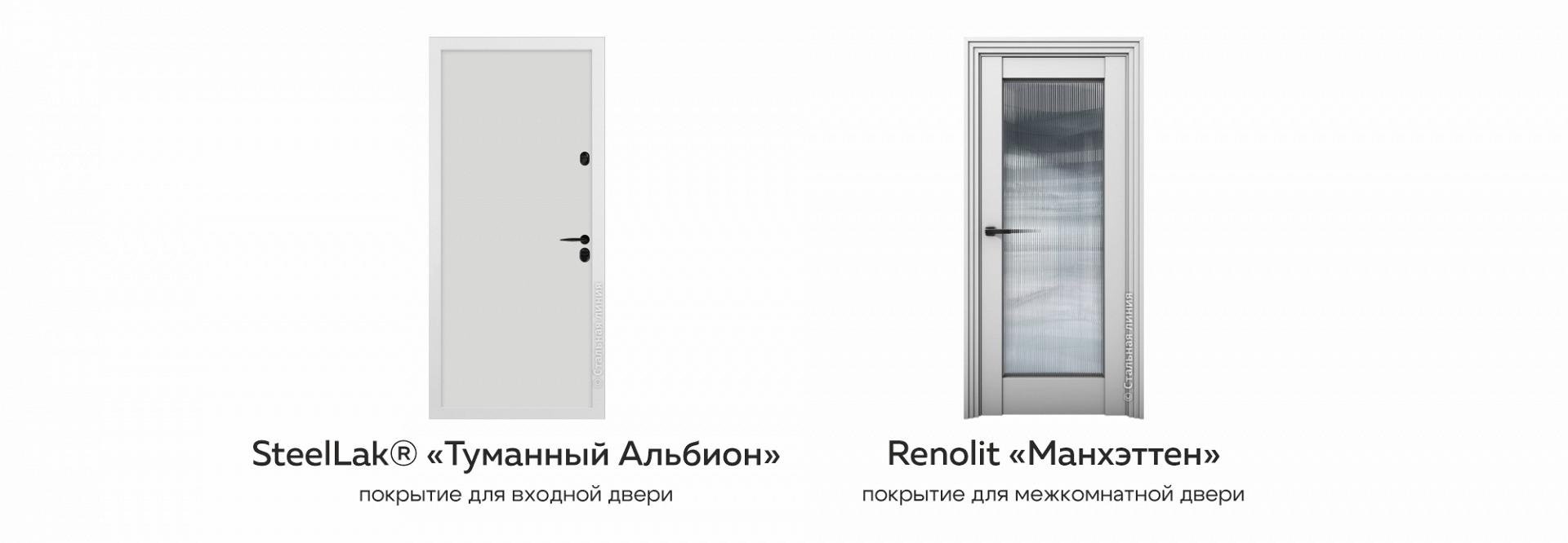 Цвета SteelLak® «Туманный Альбион», «Серый шелк», «Белый» и «Горное эхо» специально подобраны для новой коллекции входных дверей. Они подчеркнут стиль вашего интерьера, придавая ему завершенный и утонченный вид. А фирменная разработка окраски SteelLak® обеспечит повышенную прочность покрытия, защиту от царапин и истирания.