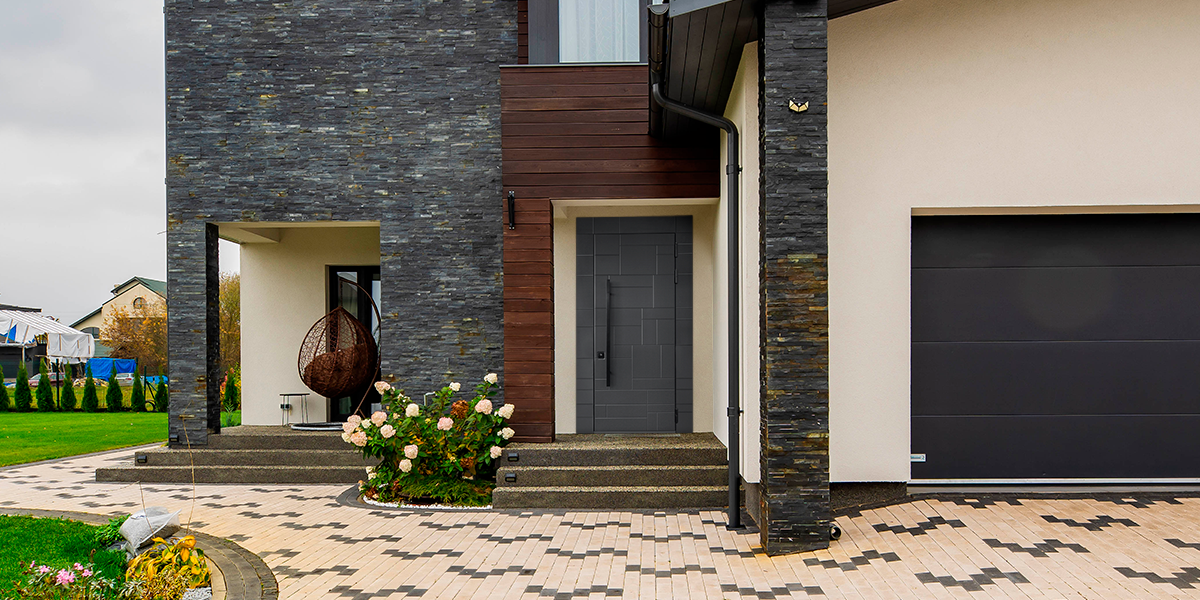 Современная модель с рейлингом — входная дверь в дом Серии 100-УТ.
