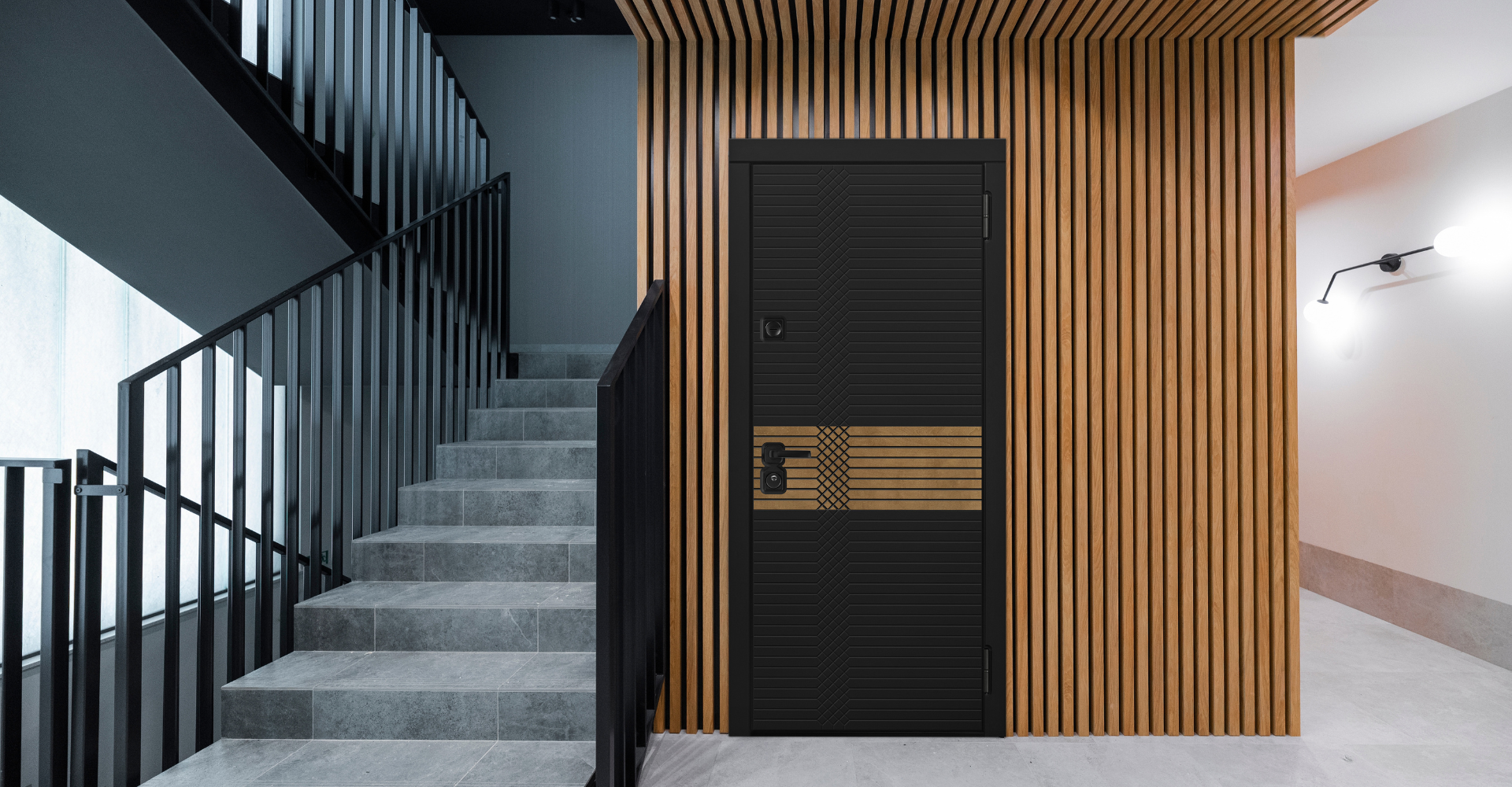Отделка выполняет не только декоративную роль – панели со звукопоглощающим эффектом с двух сторон полотна отлично справляются с устранением лишнего шума, которого с лестничной площадки доносится достаточно много. Чем больше толщина этих панелей, тем меньше посторонних звуков достигнет ваших ушей.