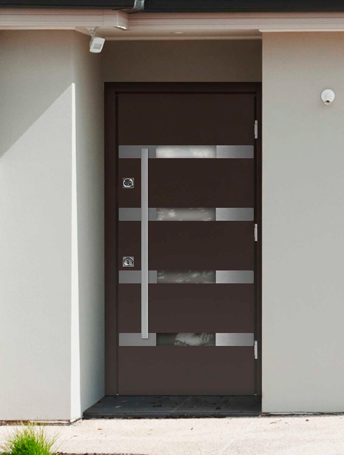 Горизонтальное окно придает двери динамичность, выглядит современно и отлично дополнит современный коттедж.