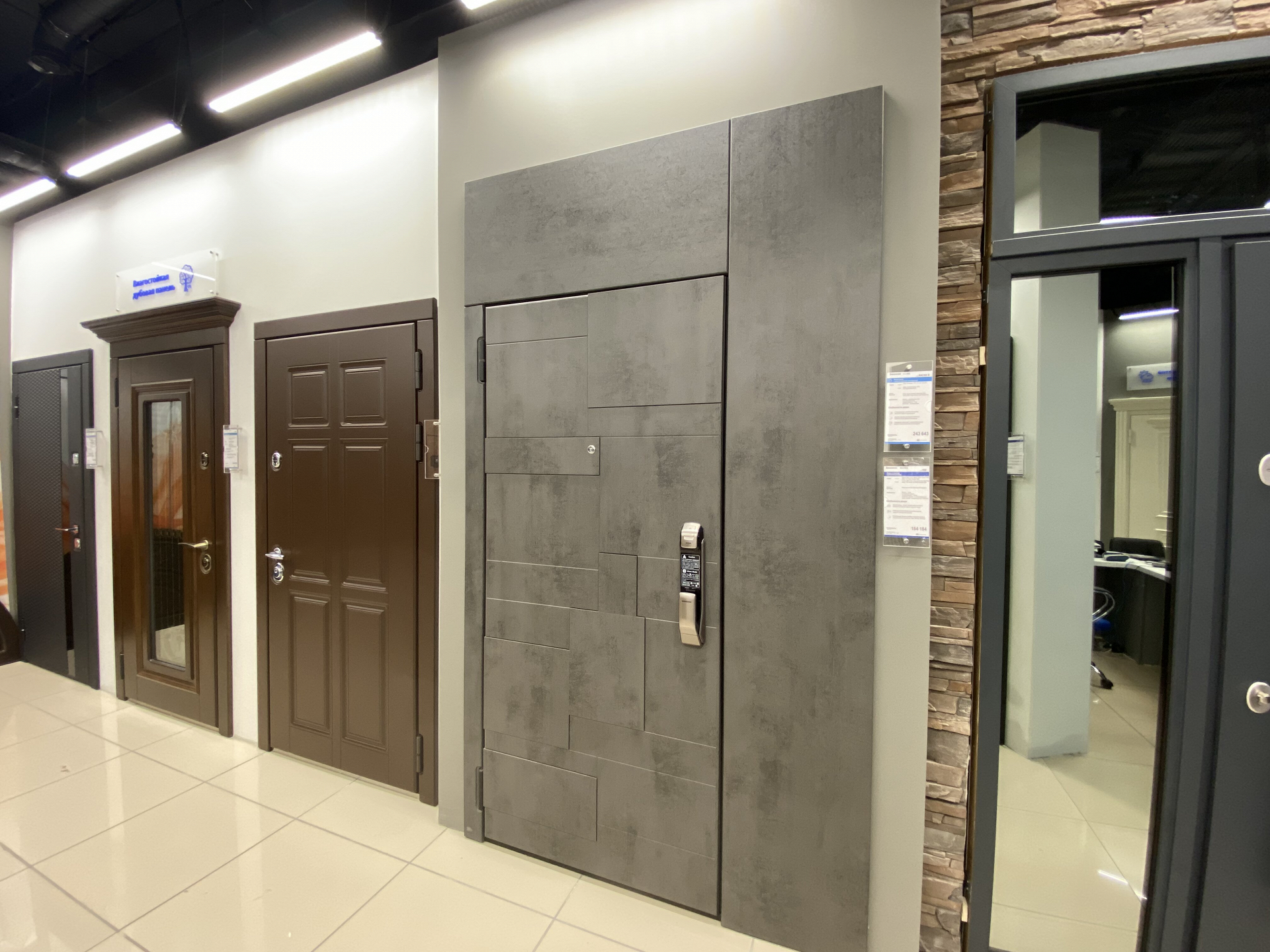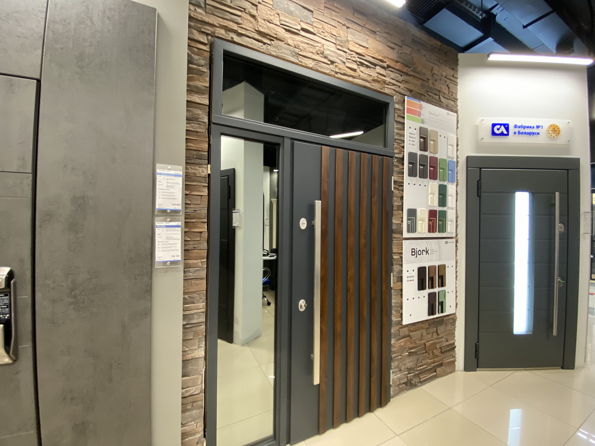 В фирменном салоне представлено 18 образцов стальных и комбинированных входных дверей классического и современного дизайна. В экспозиции вы сможете увидеть модели с умным замком, окном, с широкими и узкими наличниками, фрамугами, однопольные и двупольные двери. Разнообразие моделей позволит оценить и всевозможные отделки: из натурального дерева, ультраглянцевое покрытие, матовую поверхность. Вы сможете увидеть и протестировать удобство дверей с умным замком.