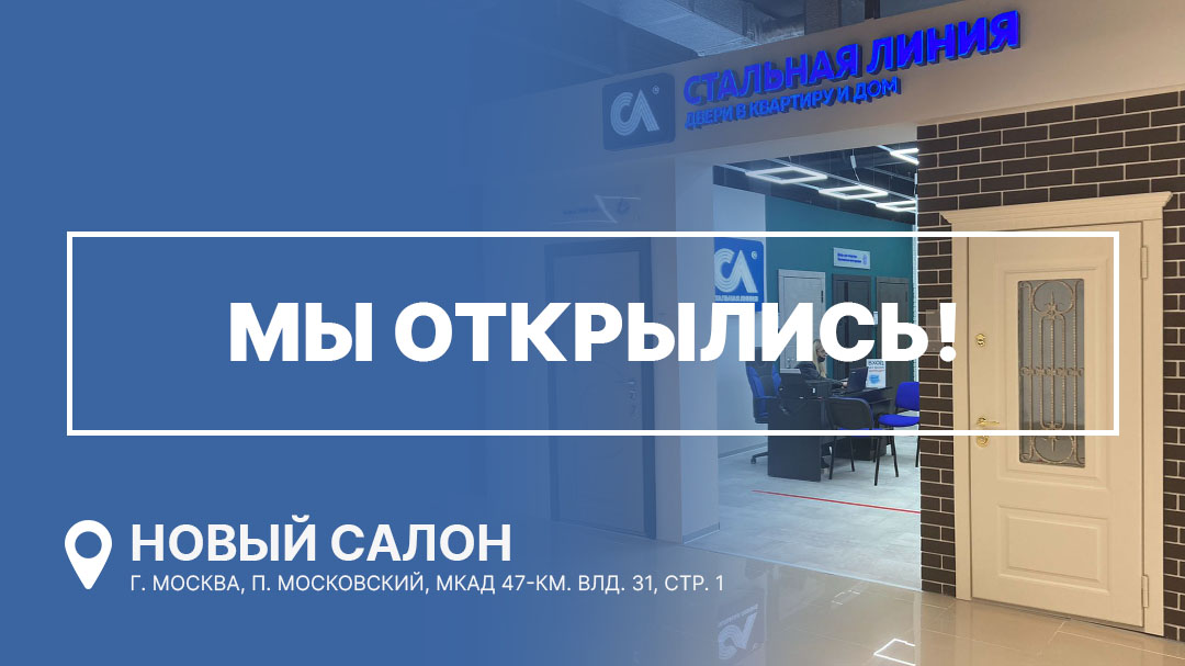 Приглашаем вас в новый фирменный салон входных дверей «Стальная линия». Он открылся в Москве, на 47-ом км МКАД, владение 31, строение 1. Салон находится в ТЦ «Лента», в «Галерее ремонта». При торговом центре есть просторная парковка для автомобилистов, без автомобиля сюда можно добраться на метро: ближайшие станции «Солнцево», «Озерная», «Говорово».