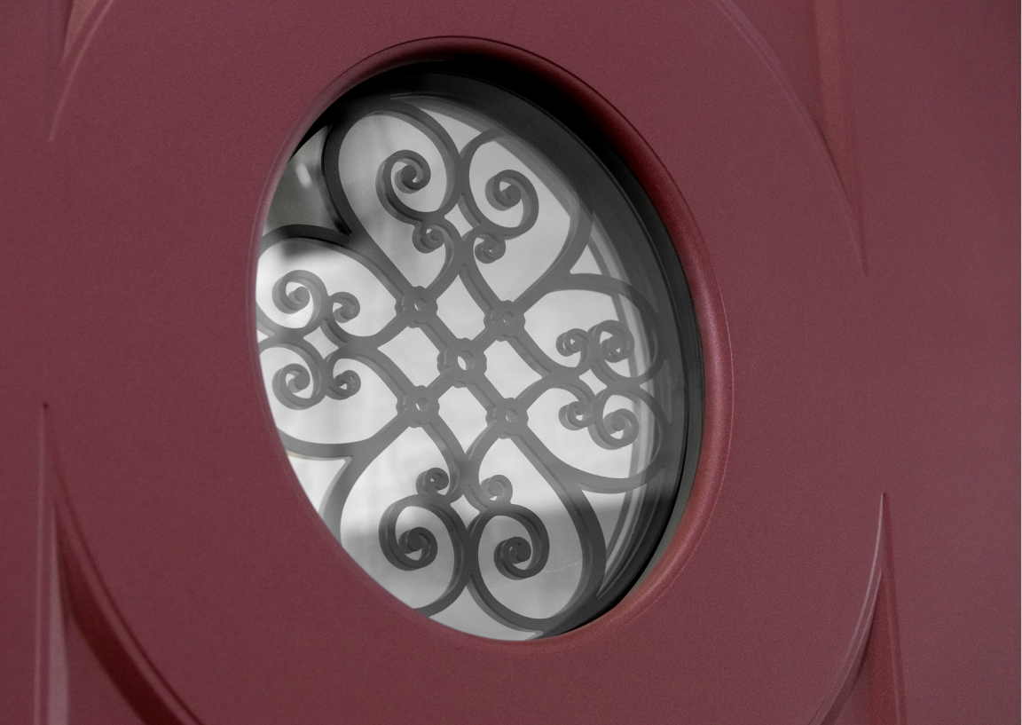 Объемная решетка О располагается снаружи полотна. Она становится акцентом, притягивающим к себе основное внимание. Объемные элементы выступают за пределы окна, а растительный рисунок поддерживают фрезеровки на полотне.