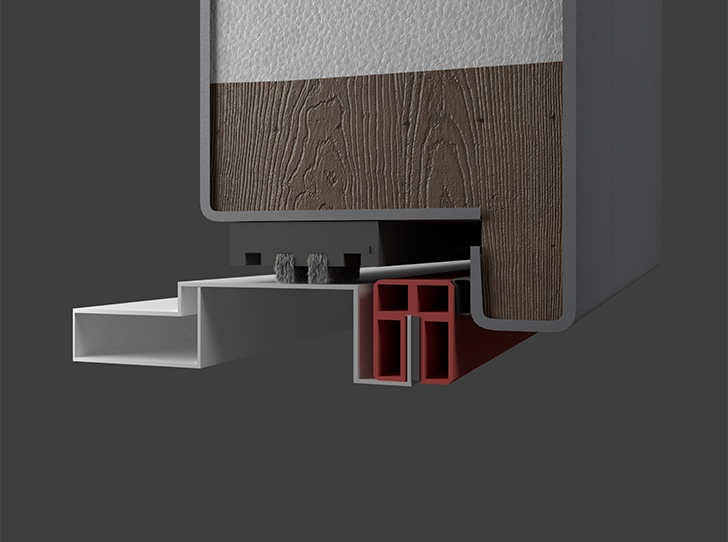 Конструкция, усиленная деревянным брусом, с 2 терморазрывами в полотне и в коробке защищает дверь от промерзания и образования наледи.