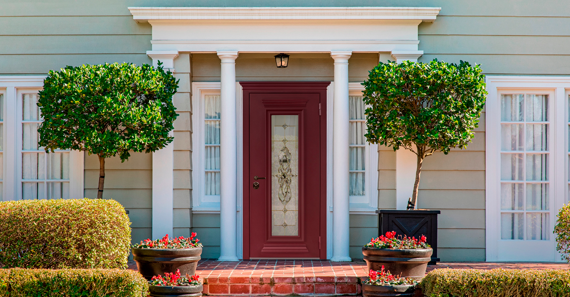 Декоративные багеты придают входной двери благородный вид и гармонично дополняют традиционный стиль коттеджа.