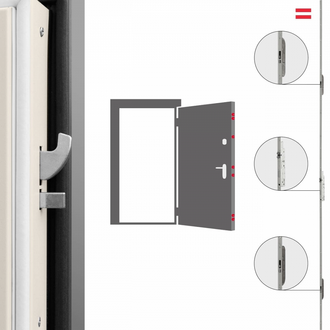 - Многоточечное запирание с комбинацией «крюк-штырь» повышает взломостойкость двери;